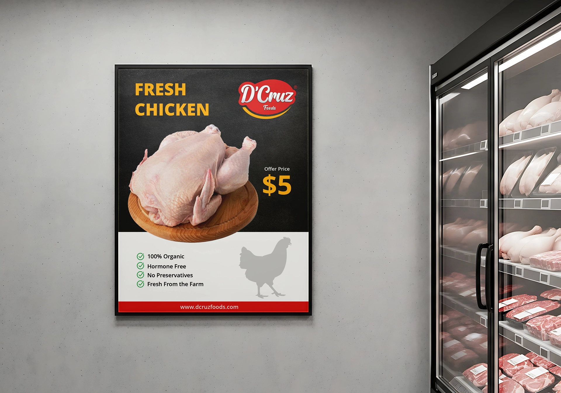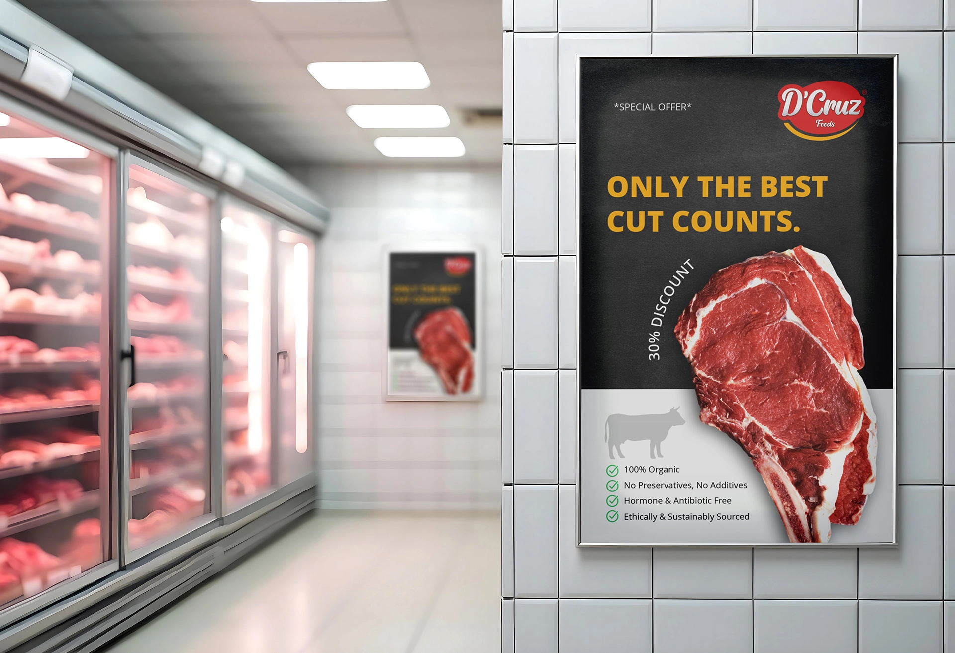 D'Cruz Foods is a premium meat and seafood brand offering fresh and processed products delivered straight to customers' doorsteps. My role was to craft a cohesive brand identity that reflected quality, trust, and freshness. The project began with designing a clean, professional logo that captured the essence of a modern food brand, followed by packaging concepts that balanced practicality with shelf appeal. The visual language was extended across print materials to ensure a consistent and recognizable brand presence. The result was a refined identity system and industry-standard packaging that strengthened D'Cruz Foods' position in the market and contributed to a noticeable increase in sales and customer recognition.