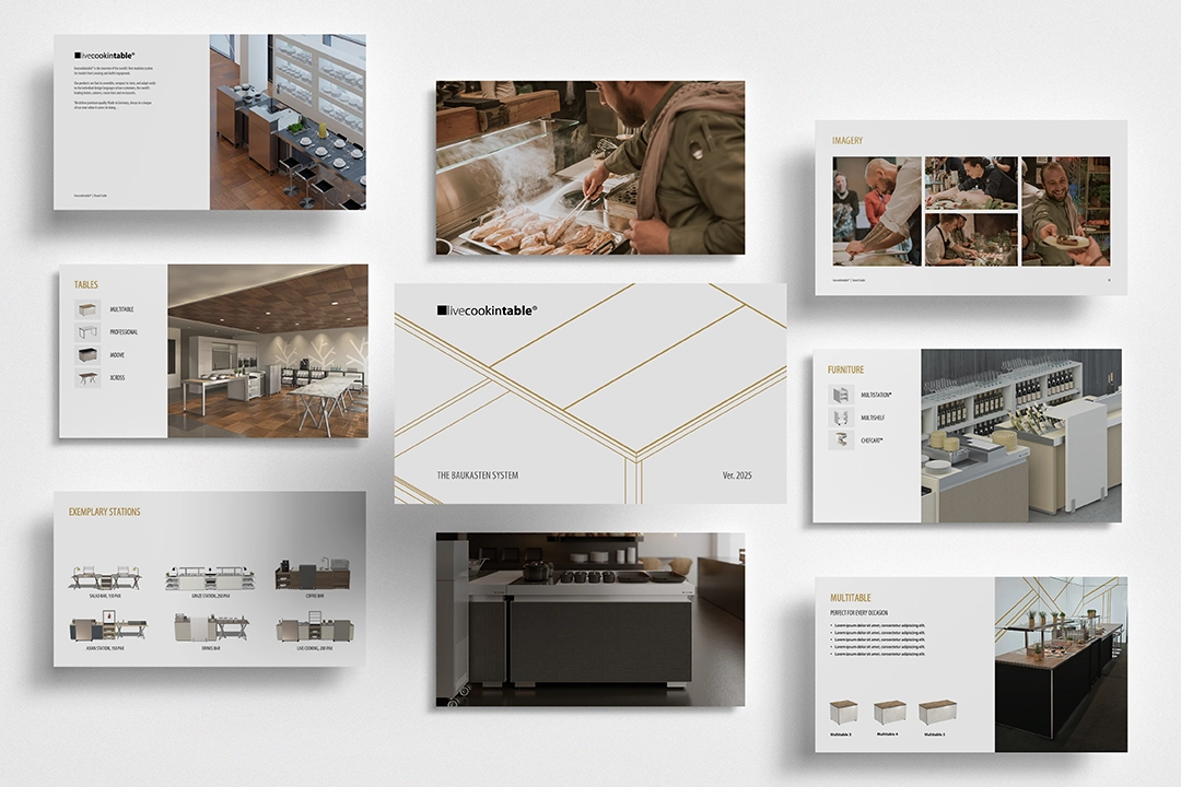 livecookintable® is a German-based premium hospitality brand known for its innovative modular cooking systems used by leading hotels and event professionals worldwide. My role was to design a cohesive range of marketing and presentation materials that effectively showcased the brand’s craftsmanship, flexibility, and design excellence. This included developing visually engaging brochures, digital assets, and presentation decks that aligned with Livecookintable’s global brand standards. The goal was to enhance the brand’s visual communication and make complex modular systems easy to understand through clear, elegant design. The result was a unified and professional visual presence that strengthened Livecookintable’s global positioning and helped support its marketing and sales initiatives across international markets